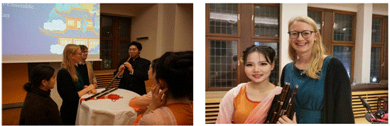 演出获得了观众们热烈的掌声和赞美,观众们纷纷上台与演员们合影留念,表达对中华文化的喜爱和赞赏。来自陕西的“老朋友”谭义明和杜菲娜热泪盈眶地表达对演出的赞美、对家乡的思念,来自帕德博恩大学的达维娜和保罗教授也与现场演奏的同学一起,尝试演奏了竹笛等中国民族乐器,了解中国传统文化。