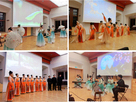 整场演出经精心编排,以中国传统音乐、舞蹈和歌曲为主要表演形式,力求将中国文化的博大精深呈现给德国观众。演出以民乐合奏《花好月圆》轻松欢乐的旋律拉开了帷幕;琵琶独奏《春雨》为观众勾勒出了中国江南水乡浓淡相宜的画卷;二胡重奏《战马奔腾》向观众展现了中国热烈且坚毅的民族精神;民乐合奏《春江花月夜》仿佛将观众们带到了如诗如画的东方月夜中;古筝独奏《春到湘江》和民乐合奏曲《秦川情》展现了湖南和陕西的地域风情,带领观众领略了中国不同地区的美丽风光和文化底蕴,感受到古筝与竹笛的独特魅力;舞蹈《飞天乐舞》以敦煌壁画中的飞天仙女形象为灵感,舞者们在舞台上如仙子般飘逸,重现了敦煌壁画的盛美;舞蹈《唐印》则将千年前的仕女形象通过现代舞蹈再现,跨越时空,展现华夏千年历史底蕴。伴着合唱《牧歌》和《乘着歌声的翅膀》悠扬的歌声,这场令人陶醉的演出落下了帷幕。