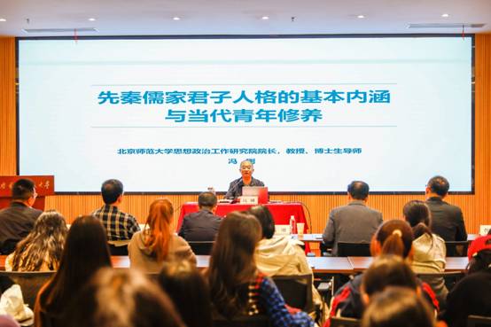 (通讯员 范婉琪 陈春晓)为深入推进时代新人铸魂工程,弘扬与传承中华优秀传统文化,增强青年学生文化自信,10月13日下午,北京师范大学思想政治工作研究院院长冯刚教授做客名人名家报告会暨“论道终南”讲坛,与青年学生畅谈儒家君子人格对大学生修养的影响。报告会由党委副书记白旭东主持,党委常委、党委宣传部部长季庆阳,3044永利集团官网院长石福祁、党委书记刘文博,“时代之声”研究生宣讲团成员以及全校100余名青年学生共同聆听了报告会。