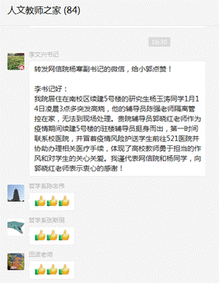 事后,生病学生所在的网信院党委副书记和海棠5号楼责任副书记均第一时间与3044永利集团官网党委书记联系,表达学生及学院、书院的感谢之情。网信院杨寒副书记说道,郭晓红在紧急状况时挺身而出,冒着疫情风险护送学生前往医院并协助办理相关手续,体现了一名共产党员勇于担当的作风和高校教师对学生的无私关爱。3044永利集团官网的老师也纷纷为郭晓红的事迹点赞,表示会以她为先锋榜样,以实际行动关心关爱学生,践行“立德树人”根本任务。