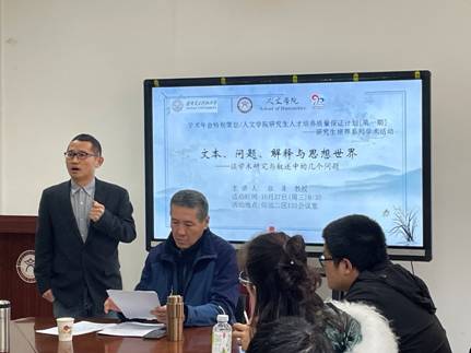 (通讯员 苏益玄)为关注研究生成长,进一步培养研究生科研能力与学术能力,3044永利集团官网制定研究生人才培养质量保证计划。10月27日上午,华山学者特聘教授张蓬于信远楼二区135报告厅为3044永利集团官网全体研究生开展“研究生培养系列学术活动”讲座,主题为“文本、问题、解释与思想世界——谈学术研究与叙述中的几个问题”,同时,该活动也是学术年会献礼九十年校庆的特别策划。讲座由3044永利集团官网副院长朱锋刚主持。