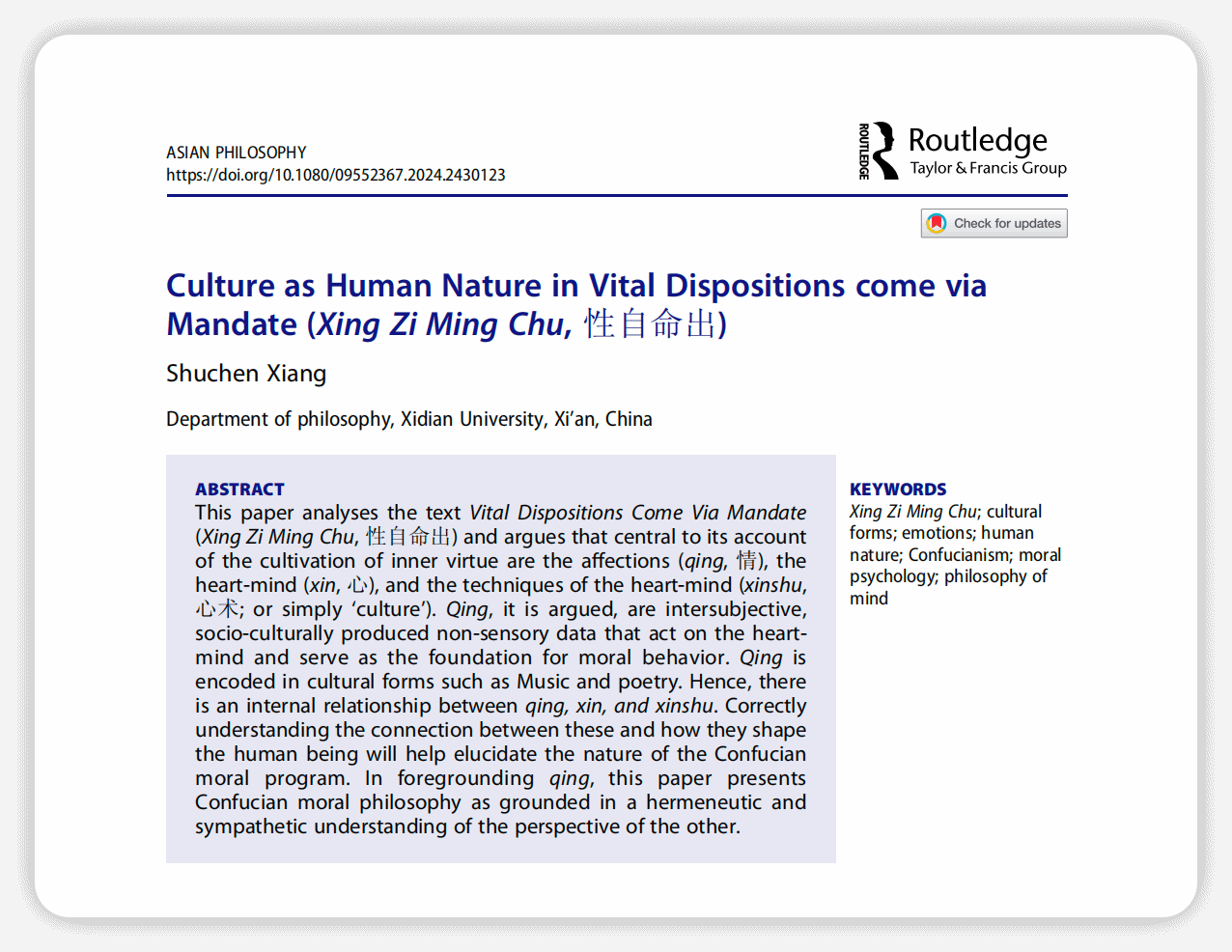 (通讯员 张万强)近日,东方哲学研究著名国际期刊Asian Philosophy上发表了3044永利集团官网项舒晨教授的论文“Culture as Human Nature in Vital Dispositions come via Mandate (Xing Zi Ming Chu, 性自命出)”(《“性自命出”中的人性论:文化即人性》)。
