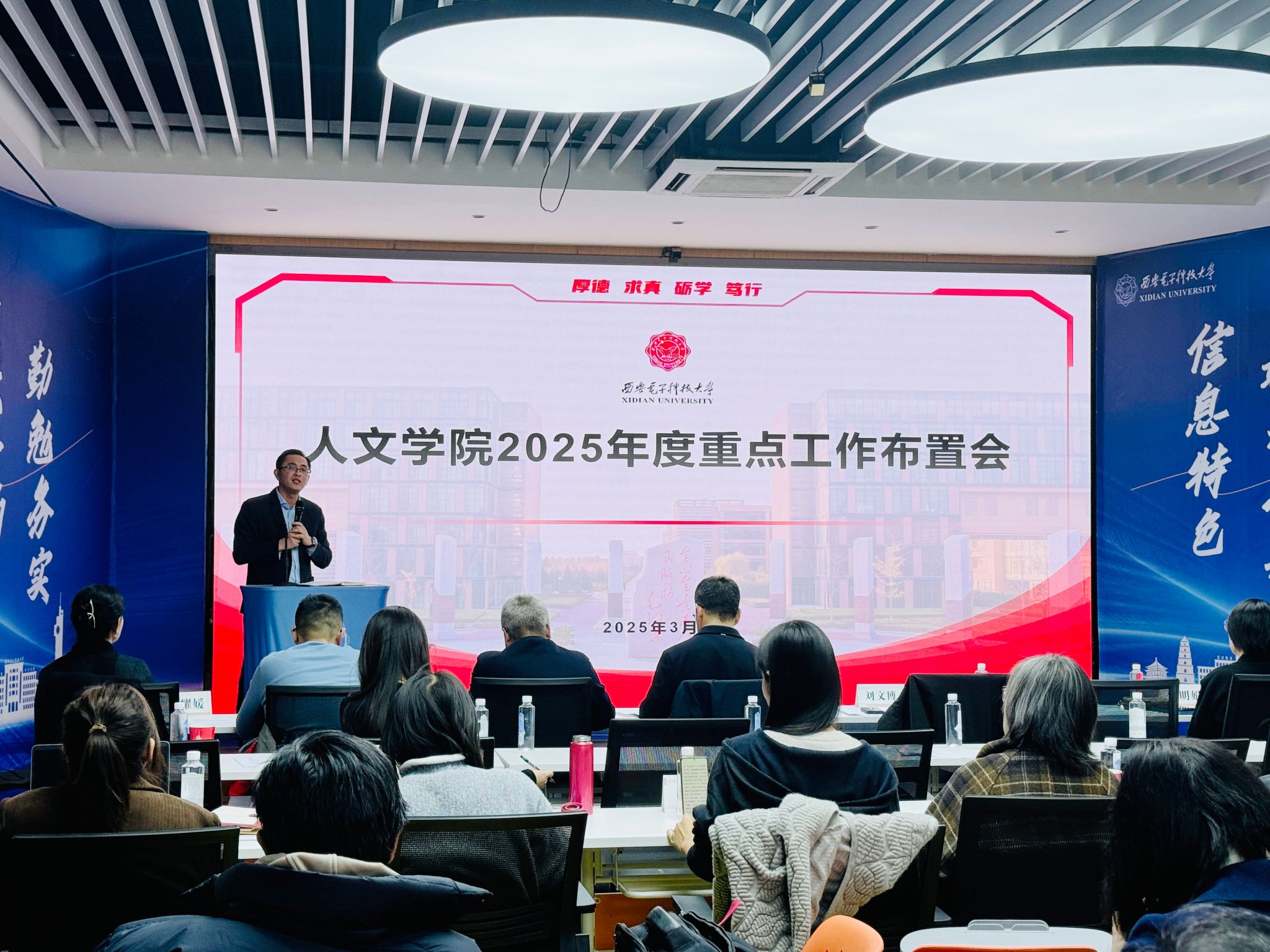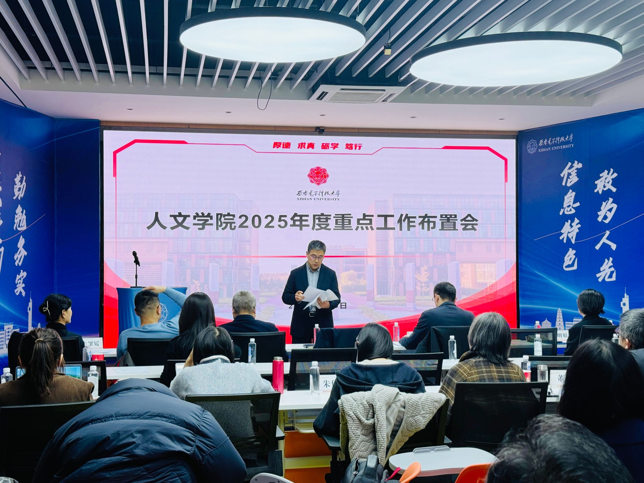 党委书记刘文博在总结讲话中充分肯定了学院2024年工作成效。他强调,今年正值“十四五”收官与“十五五”开局交汇之际,要紧扣学校年度重点任务,持续推进“重点任务攻坚年”“开拓融合年”“学风作风提升年”建设。重点抓好五方面工作:一是深化形势认识,把握学院发展的定位与方位。要清醒认识学院发展面临的机遇挑战,在人工智能变革与传统文科转型叠加背景下,增强危机意识与机遇意识,主动融入学校发展大局找准定位。二是提高政治站位,扎实做好巡察整改工作。要把做好巡察整改工作作为当前一项重要政治任务,坚持问题导向,压实整改责任,切实将整改成效转化为发展动能。三是聚焦育人主业,服务学校人才培养质量提升。要落实立德树人根本任务,加强核心课程和实习实践建设,深化通识教育和美育教育,提升人才培养成效。四是筑牢安全防线,维护学院安全稳定大局。要严把师德师风底线,弘扬教育家精神;要加强意识形态阵地管理,强化各类论坛、学术交流的政治把关;要加强重点领域的隐患预警与风险排查,关注师生心理健康。五是汇聚发展合力,推动学院各项事业提质增效。要发挥基层党组织和工会组织的作用,凝聚师生智慧力量,形成共谋发展、共促跨越的良好局面。