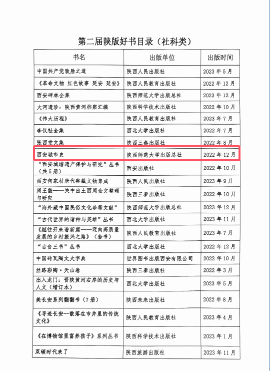 “十三五”国家重点图书出版规划项目、国家出版基金项目、陕西出版资金精品项目《西安城市史》丛书,由陕西师范大学出版总社于2022年12月出版,于2024年1月荣获陕西省第十六次哲学社会科学优秀成果奖(著作类)二等奖。2025年1月9日,在北京举行新书发布会。