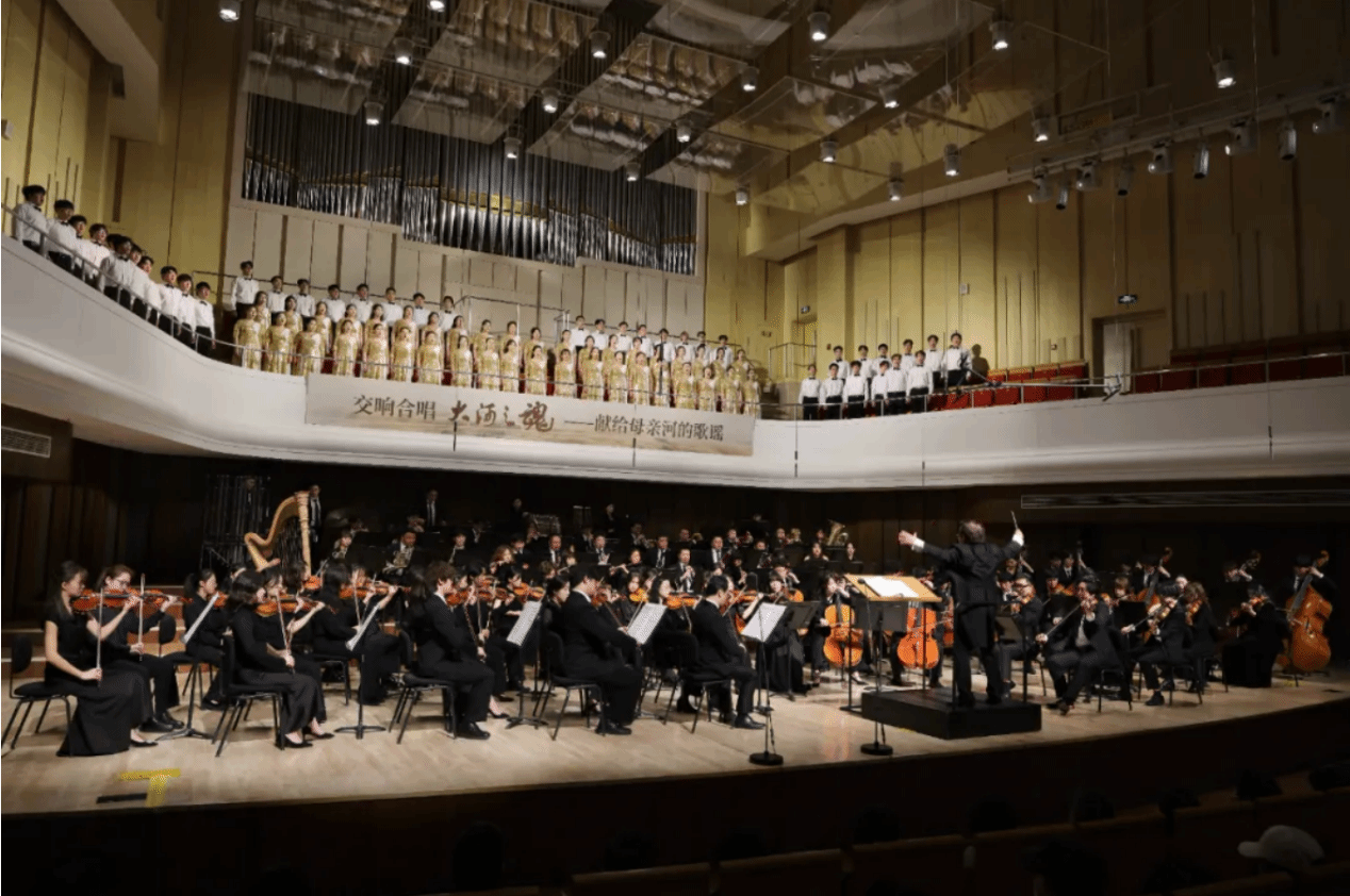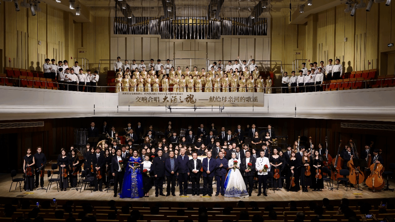 《大河之魂》 是西安音乐学院集合创演资源,倾⼒打造的大型原创交响合唱套曲,由西安音乐学院党委副书记强陆平教授作词,陈大明教授与陈书婷作曲,作品以黄河文化为创作主线,选取黄河流域不同地域文化背景下具有鲜明特点的民族民间音乐元素进行交响化呈现以交响合唱的形式对黄河流域历史文化全貌进行诠释。从黄河流经的地理全貌和中华历史文化的纵深运用艺术的手法进行多维度描述。西安音乐学院交响乐团与合唱团以精湛技艺演绎了源远流长、雪山清泉、平川放歌、拥抱草原、九曲⼗⼋弯、回望千年、巨龙腾飞、追赶太阳六个乐章。恢弘的乐章与激昂的合唱交织,再现了黄河百折不挠的壮阔图景,令现场师生心潮澎湃。