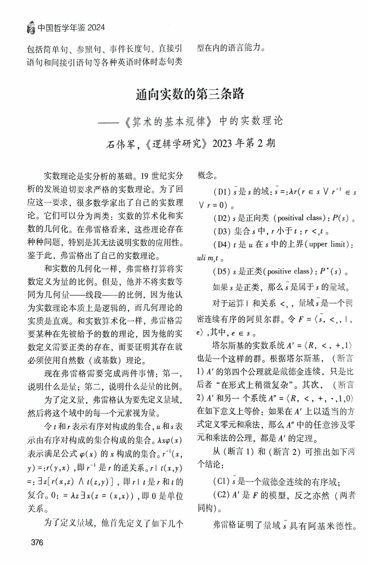 (通讯员 张妍)近日,石伟军副教授研究成果“通向实数的第三条路——《算术的基本规律》中的实数理论”被《中国哲学年鉴2024》收录。