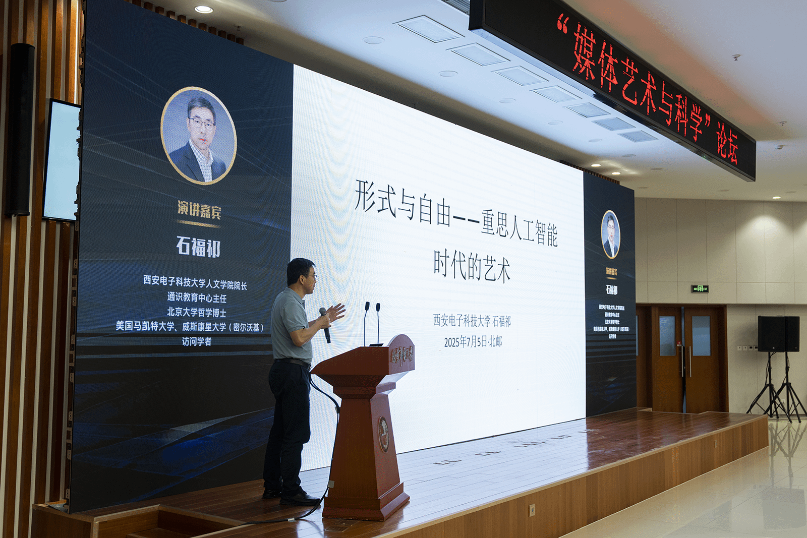 为学习借鉴兄弟院校通识教育和美育工作的先进理念与经验,7月5日,西电通识教育中心一行三人赴北京参加由北京邮电大学主办,北邮数字媒体与设计艺术学院、美育中心等单位承办的“媒体艺术与科学”论坛。来自“四邮四电”八所电子信息特色高校的专业同行,以及中国传媒大学、北京电影学院、中央戏剧学院、清华大学等院校专家学者齐聚一堂,就媒体艺术与科学技术交叉领域的理论前沿、实践创新与未来趋势进行研讨。北京邮电大学副校长任雄飞致欢迎辞,中国传媒大学教授、中国高等院校影视学会数字艺术与动画专委会常务副主任张歌东为论坛致辞。我校3044永利集团官网院长、通识教育中心主任石福祁教授应邀在论坛上做主题发言。