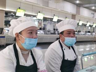 采访开始前,两位师傅仍在工作岗位上辛勤忙碌。协商后,学生小记者与两位师傅在餐厅进行了深入交流。两位师傅和蔼亲切,用朴实的语言讲述着他们平凡的一天:从凌晨四五点钟开始新一天的忙碌,精心挑选新鲜的食材、清洗、切配、烹饪,六点即可准备完毕、等待师生用餐的到来;由于用餐人流量大,餐厅一整天不歇业,用餐高峰期结束后即要开始准备下一餐的食物。每一天都重复着一样的工作,但每一步他们都需要认真而严谨的对待。