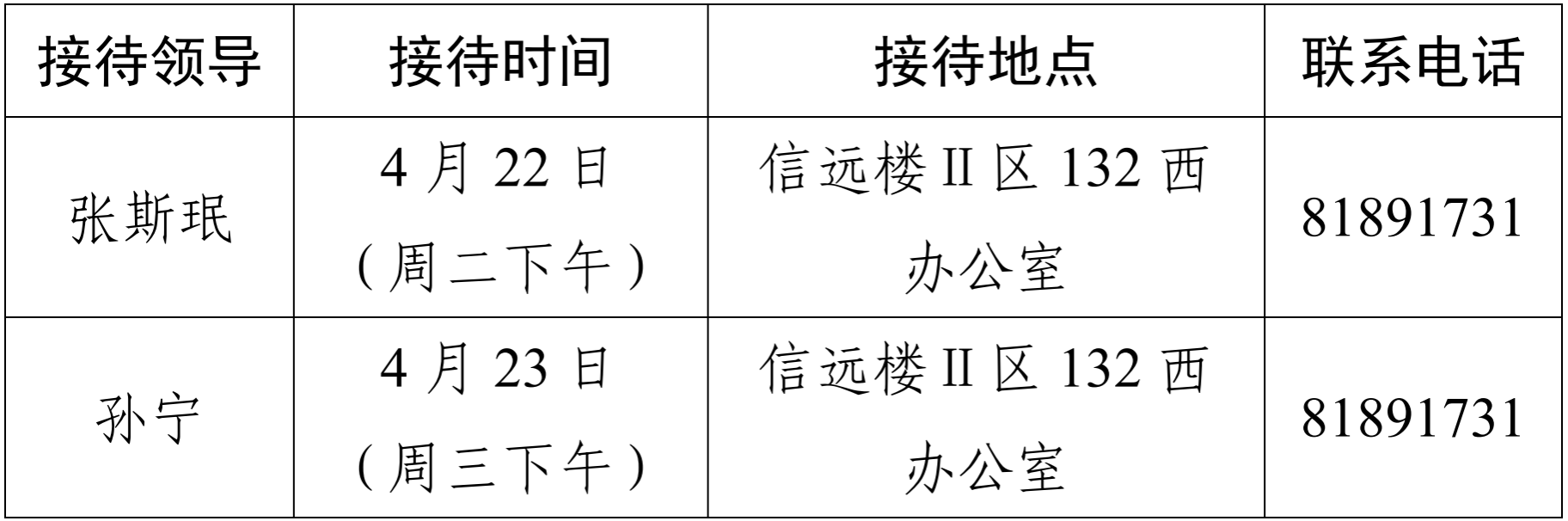 根据《3044永利集团官网领导班子接待日制度》精神,每周安排两位学院领导接待师生。现将4月21日-25日学院领导接待安排公布如下: