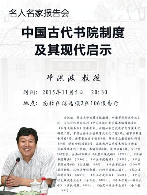 邓洪波,湖南大学岳麓书院教授,中国书院研究中心主任,国际合作学术丛刊《中国书院》副主编兼编辑部主任,《书院文化书库》首席专家。长期从事历史教学与学院文化研究工作。曾经主持、参加国家重大文化工程1项、国家社科基金项目5项、国家重点图书项目8项、湖南省及教育部社科项目6项,港台合作项目2项,在国内外公开发表论文百余篇,出版学术著作十余部、参编词典6部、整理古籍8部,合计近500万字。主要心血凝于《岳麓书院史略》(1986)、《中国书院辞典》(1996)、《中国书院制度》(1997)、《中国书院史资料》(全三册,1998)、《中国书院史》(2004年简体初版,2005年繁体初版,2006年简体二版)、《长江流域的书院》(2004)、《东亚历史年表》(2005)、《中国状元殿试卷大全》(全二册,2006)、《千年学府--湖南大学》(英汉对照,1996)、《钦定四库全书总目》(全二册,1997)。