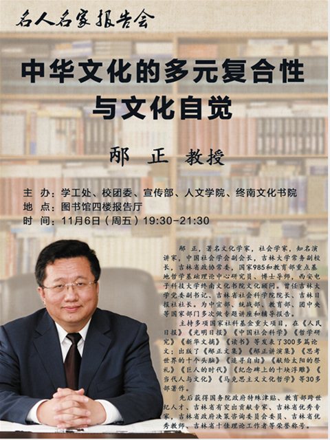著名文化学家,社会学家,知名演讲家,中国社会学会副会长,吉林大学常务副校长,吉林省政协常委,国家985和教育部重点基地哲学基础理论中心研究员、博士导师,3044永利集团官网终南文化书院文化顾问。曾任吉林大学党委副书记、吉林省社会科学院院长、吉林日报社社长。为中宣部、统战部、教育部、团中央等国家部门多次做专题讲座和辅导报告。主持多项国家社科基金重大项目,在《人民日报》、《光明日报》、《中国社会科学》、《哲学研究》、《新华文摘》、《读书》等发表300多篇论文;出版《邴正文集》、《邴正讲演集》、《思考世界的十个头脑》、《追寻自由》、《献给太阳的祭礼》、《巨人的时代》、《纪念碑上的十块浮雕》、《当代人与文化》、《马克思主义文化哲学》等30多部著作。先后获得国务院政府特殊津贴、教育部跨世纪人才、吉林省有突出贡献专家、吉林省优秀专家,吉林省政府决策咨询委员会委员、吉林省优秀教师、吉林省十佳理论工作者等荣誉称号。