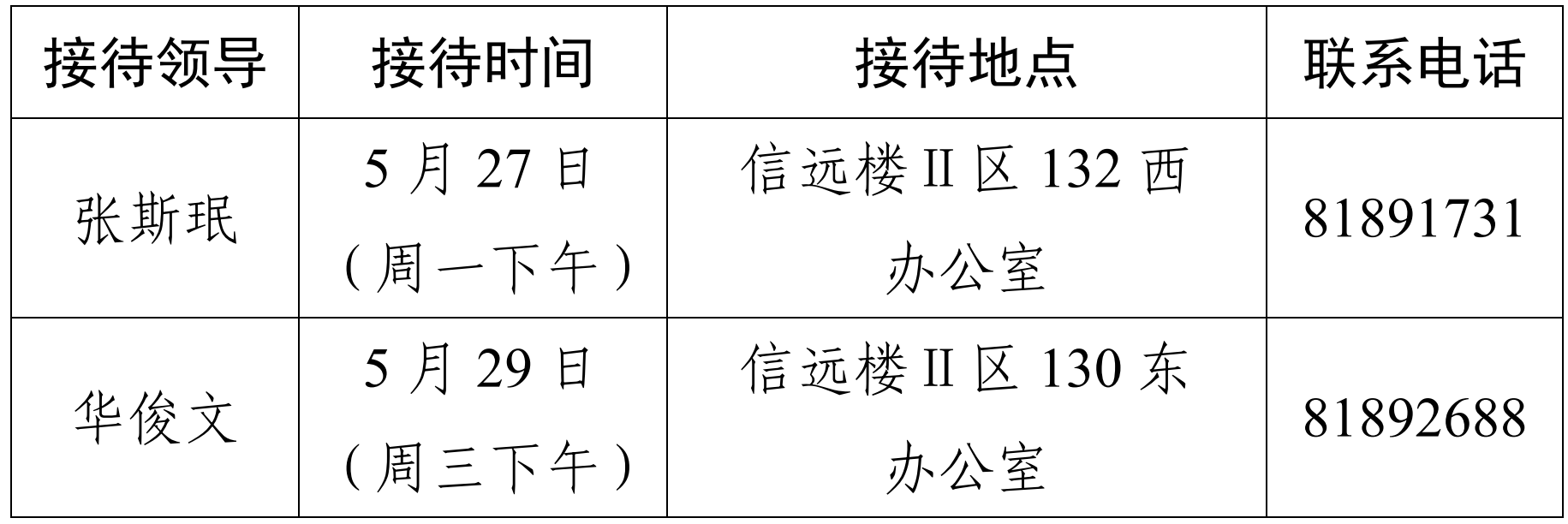 注:学院领导班子接待日主要受理的事项:1.学院人才培养、教学科研、学科建设、教师发展、对外交流、学生管理和服务保障等方面存在的问题与建议;2.反映有关学院重要决策和重要工作事宜的问题;3.涉及师生员工利益的申诉和诉求;4.亟须学院处理的难点问题;5.其他方面的建议和意见。