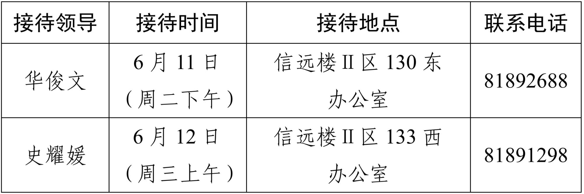 注:学院领导班子接待日主要受理的事项:1.学院人才培养、教学科研、学科建设、教师发展、对外交流、学生管理和服务保障等方面存在的问题与建议;2.反映有关学院重要决策和重要工作事宜的问题;3.涉及师生员工利益的申诉和诉求;4.亟须学院处理的难点问题;5.其他方面的建议和意见。