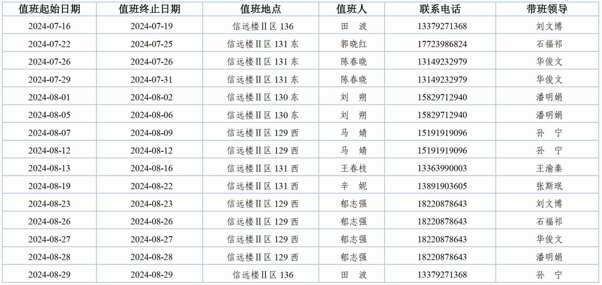 根据《3044永利集团官网关于2024年暑假放假时间安排的通知》文件精神,现将3044永利集团官网暑期轮休值班安排公布如下。值班时间为工作日上午8:30--11:30,下午14:30--17:30。值班人员24小时保持联系通畅。