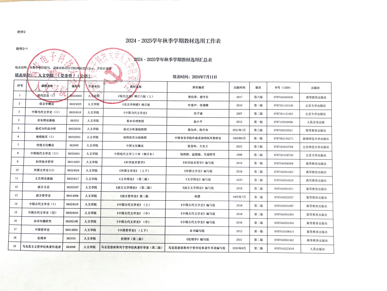 根据学校《关于进一步做好2024-2025秋季学期教材选用工作的的提醒函》的要求,3044永利集团官网教材审核工作组严格按照专家审读、集体决策、党委把关的流程,对2024~2025学年秋季学期所有固定教学用书开展了学术审核和政治审核,审核结果为通过。现将2024~2025学年秋季学期教材选用工作表公示如下,公示期至教材选用工作结束(开学后一周)。