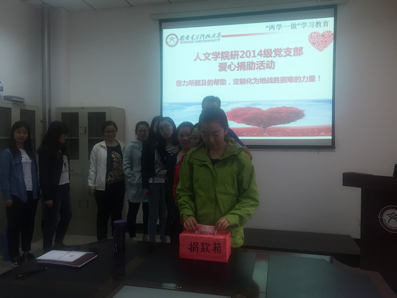 5月25日,西安阴云密布,终南山下的西电校园有几分凉意。然而,信远办公楼135会议室却显得格外温暖和温馨。当日下午三点,3044永利集团官网研140801党支部遵照学院党委“两学一做”学习教育实施方案的相关要求,积极响应学院党委《至全体党员的倡议书》的号召,深入落实本支部“两学一做”学习教育计划中“躬身实践,周行一善”的活动安排,在信远135开展了一场爱心捐助活动。