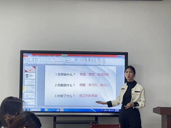 2019级汉语言文学专业本科毕业生白泠漪,现为西北政法大学法学研究生。她征集了同年级毕业生的就业情况,针对考公考编与企业两个不同的就业方向咨询了相关建议。在分享之前她向同学们提问:“你想做什么?你能做什么?你做了什么?”并提醒同学们,在做计划时应结合自身性格、未来理想、所掌握技能、是否有足够的责任心等相关因素综合考虑。同时,她告诫同学们不论是学习、就业还是生活,都不要眼高手低。踏实去做,不要好高骛远。最后,她鼓励同学们大胆去想,小心去做,以热爱为动力,以专业为底气,以机遇为挑战,活出属于自己的精彩人生。